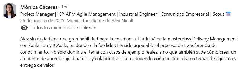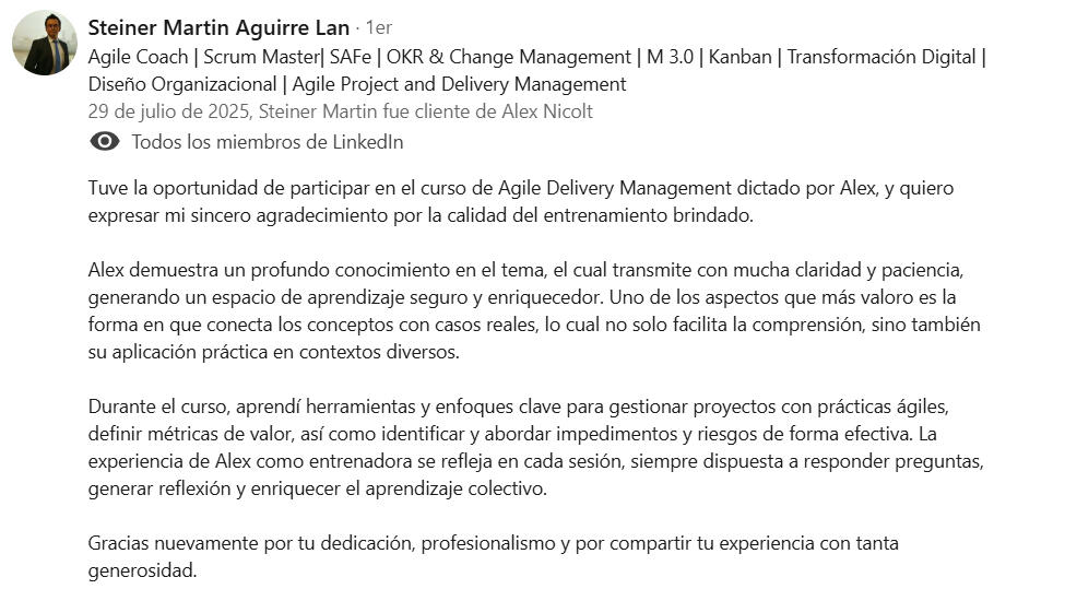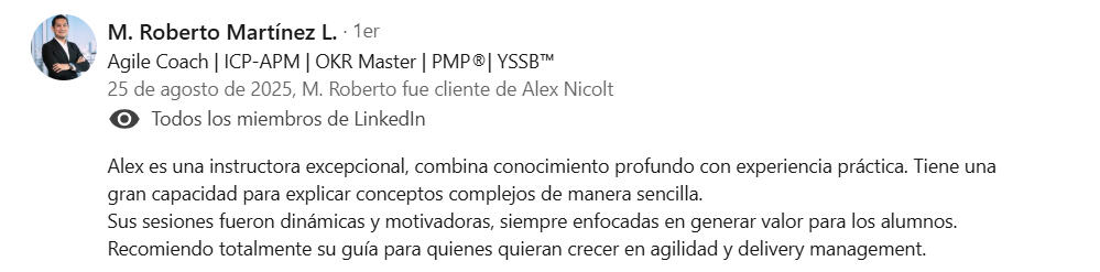 Alex posee 9 años de experiencia impulsando procesos sistémicos para equipos ágiles, facilitando la adopción de diversos modelos de trabajo, el desarrollo de soluciones tecnológicas y el análisis y documentación integral de procesos, así como de requerimientos técnicos y de negocio. Además, cuenta con más de 12 años liderando equipos de manera servicial, apoyando transformaciones organizacionales, promoviendo una cultura orientada al comportamiento y asegurando la entrega continua de valor. A lo largo de su carrera, ha desempeñado roles como Analista Funcional, Product Owner, Facilitador Ágil, Coach de Sistemas, Coach de Agilidad y Delivery Manager en el sector de Banca & Finanzas. Es Ingeniera Industrial graduada de la Universidad Militar Nueva Granada y Especialista en Gerencia de Experiencia Digital por la Universidad Externado de Colombia. Asimismo, destaca por su pasión por el aprendizaje y la enseñanza, siendo instructora autorizada para el curso ICP-APM.