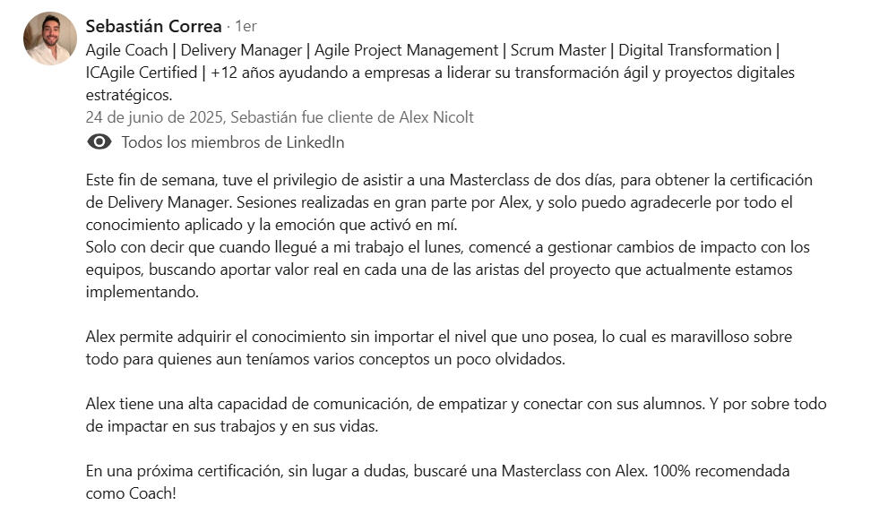 Esta masterclass te brinda la oportunidad de unirte a una vibrante comunidad de profesionales ágiles, expandir tu red y liderar la transformación ágil en tu organización. Serás equipado con herramientas, habilidades y conocimientos que te destacarán en el mercado laboral de Delivery Management, garantizando la entrega continua de valor y excelencia en la gestión de proyectos y el incremento de productos. No pierdas la oportunidad de transformar tu carrera y tu organización con Agile fun!